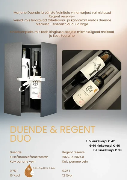 Marjane Duende ja Järiste Veinitalu viinamarjast valmistatud Regent reserve–